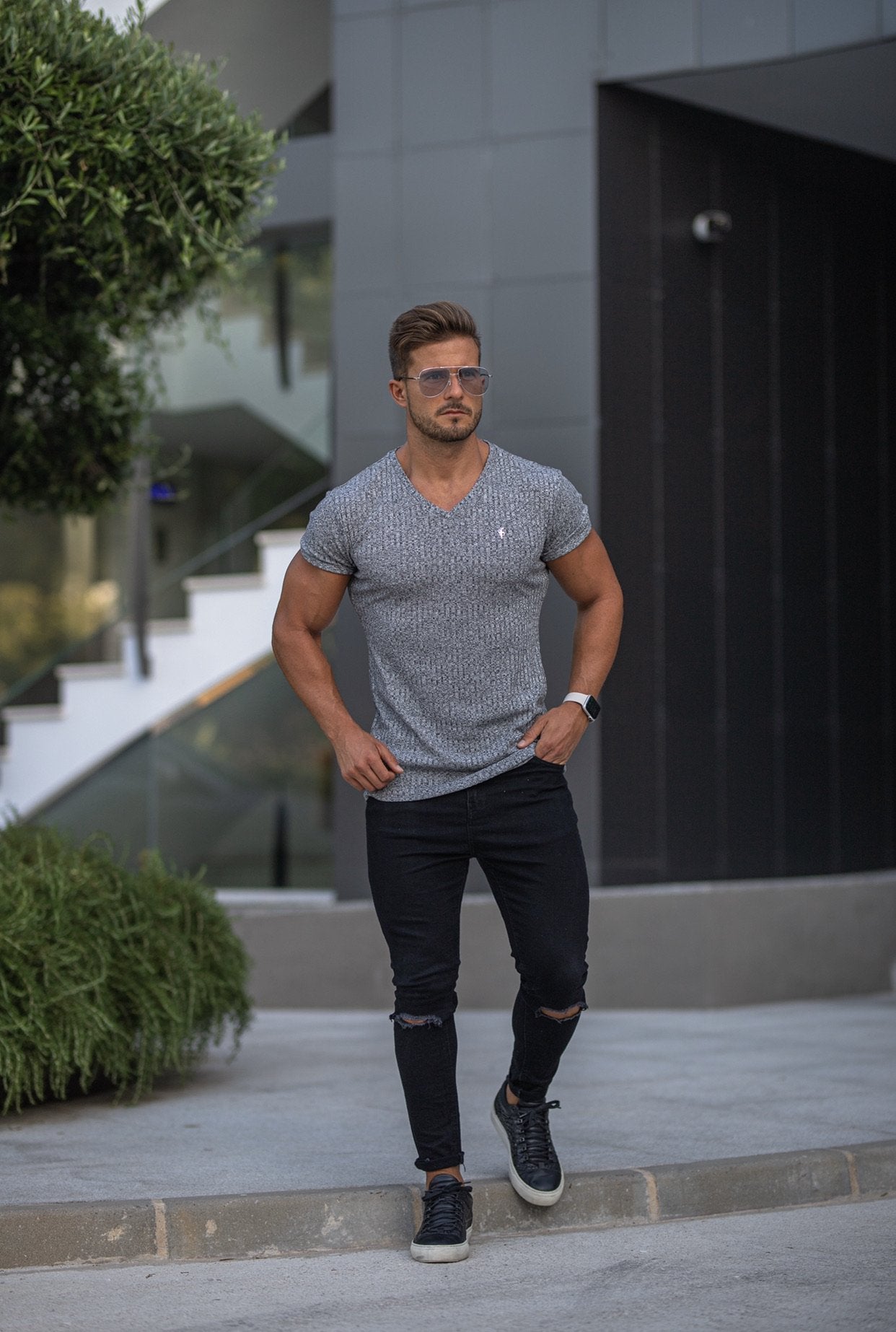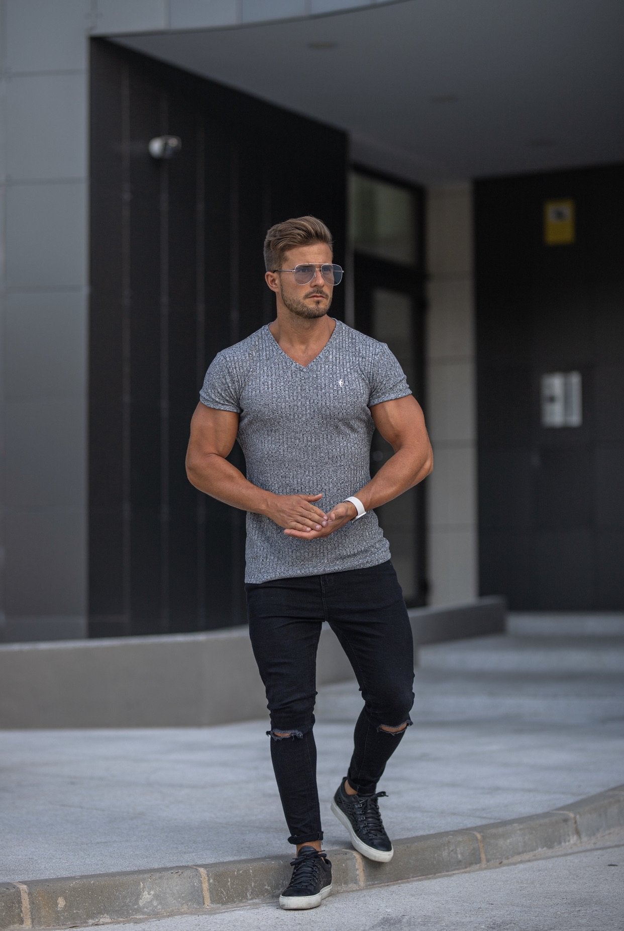 Father Sons Classic Grey / Silver V Neck Ribbed Crew - FSH491