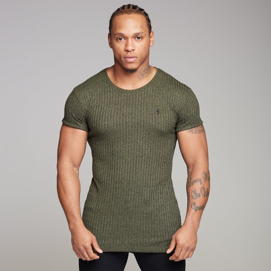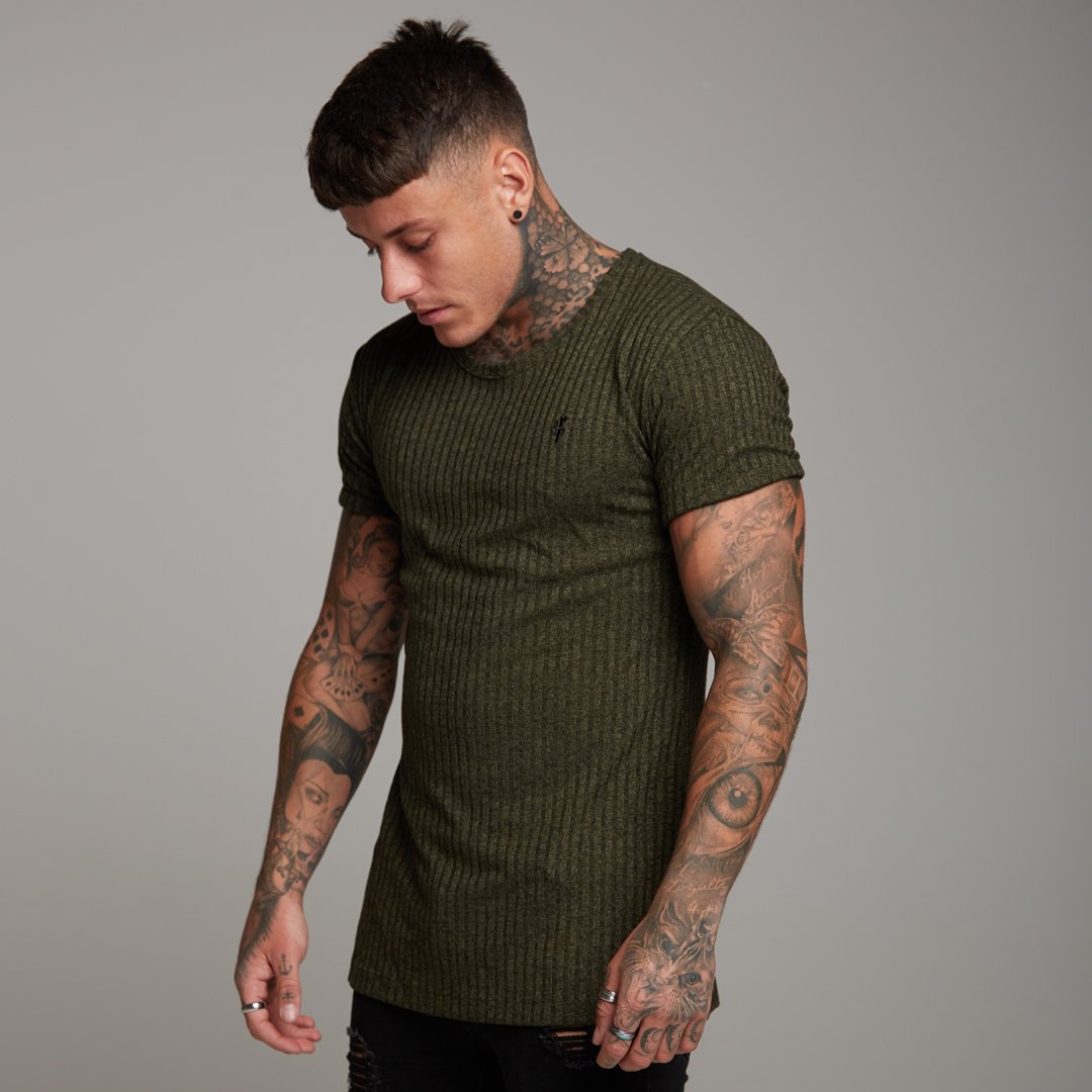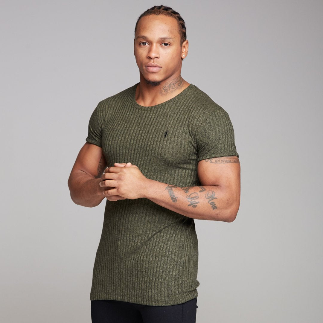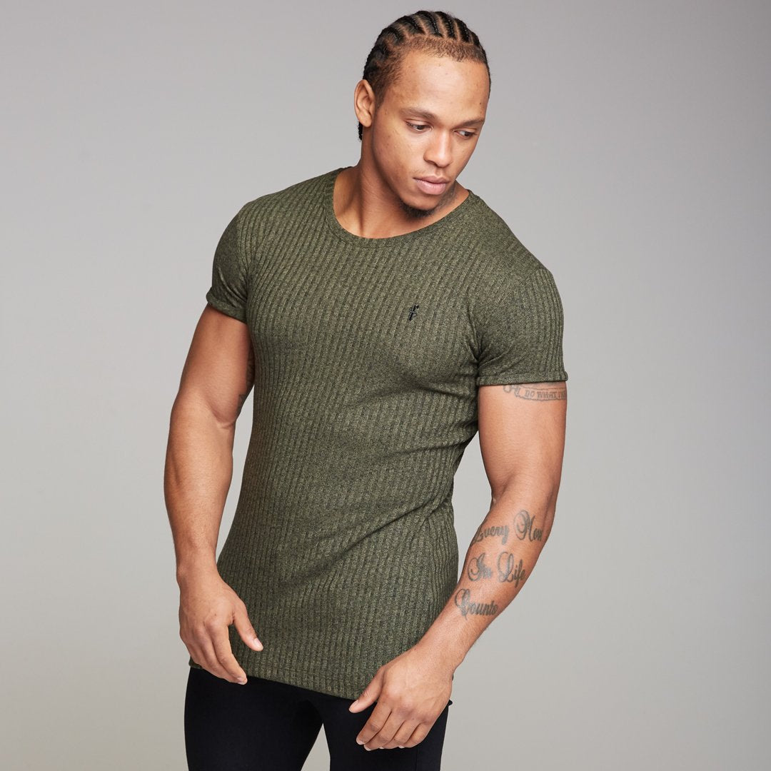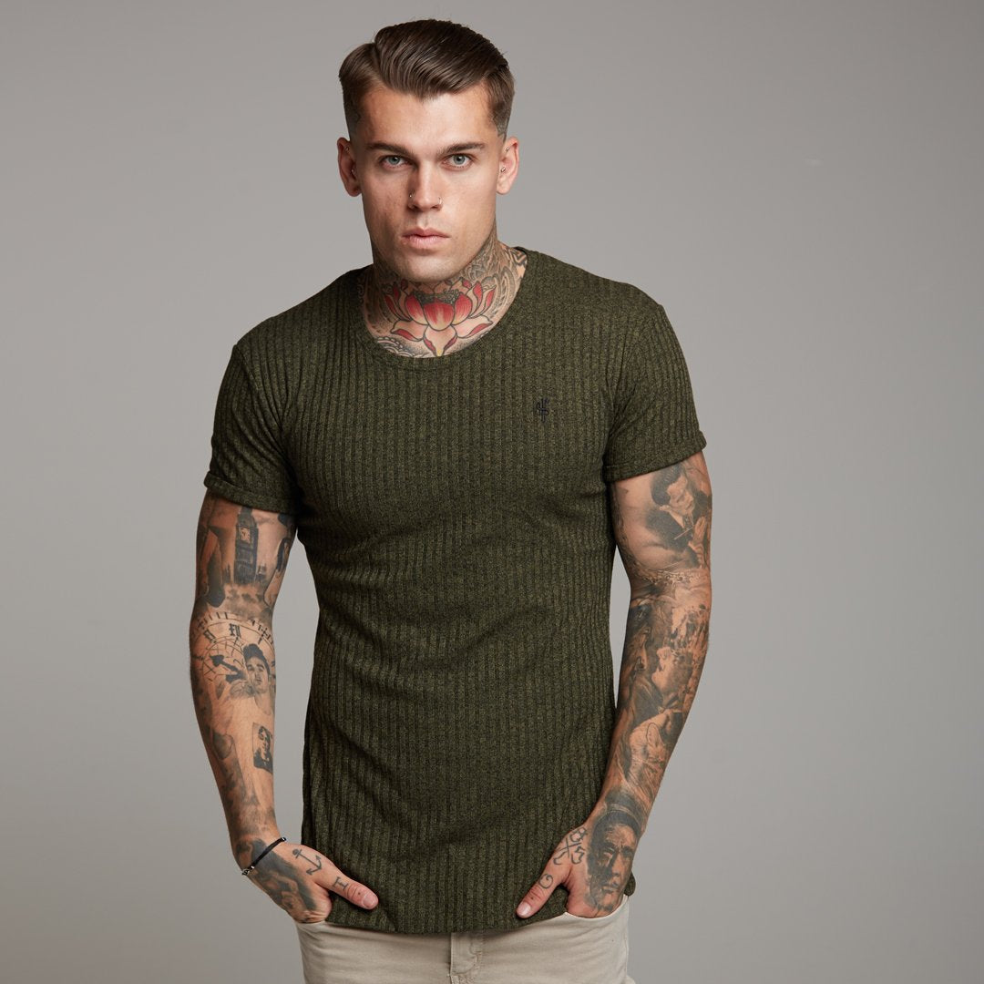 Father Sons Classic Khaki Ribbed Knit Super Slim Long Line Crew - FSH172