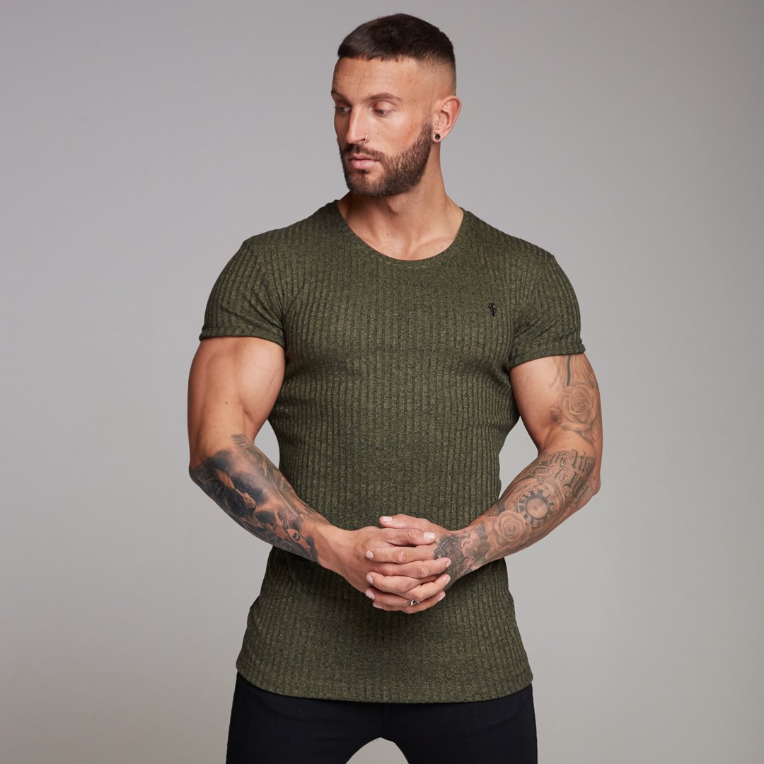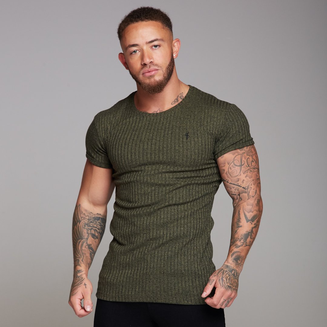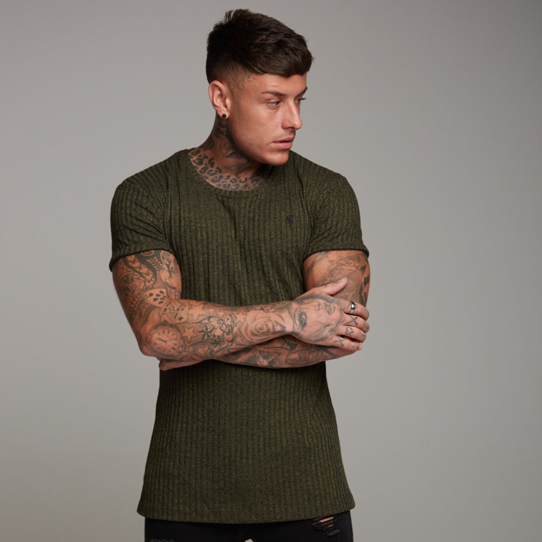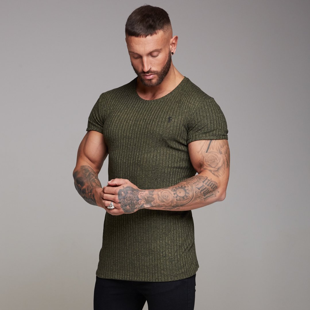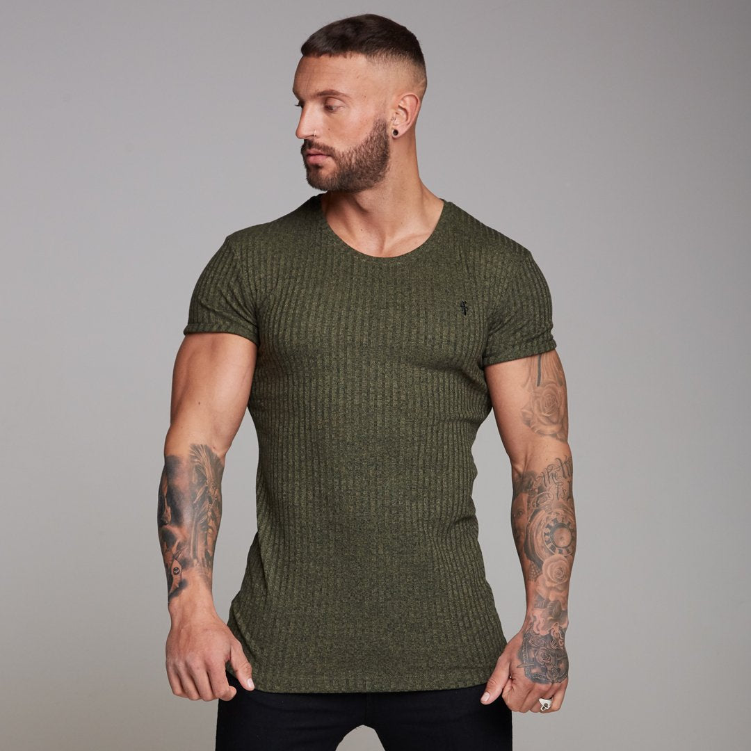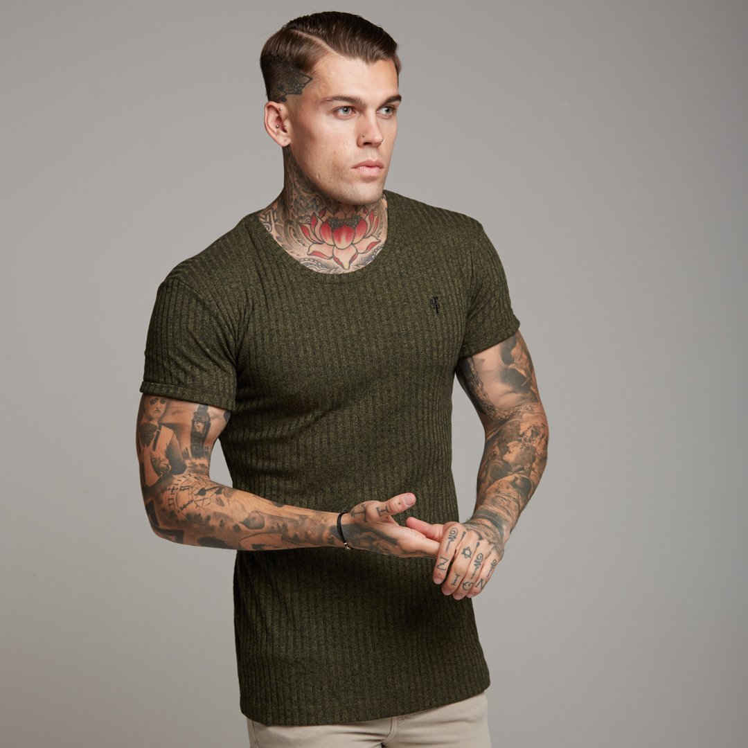 Father Sons Classic Khaki Ribbed Knit Super Slim Long Line Crew - FSH172