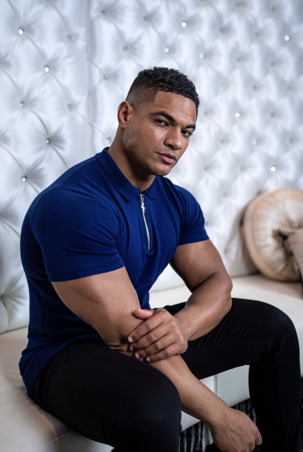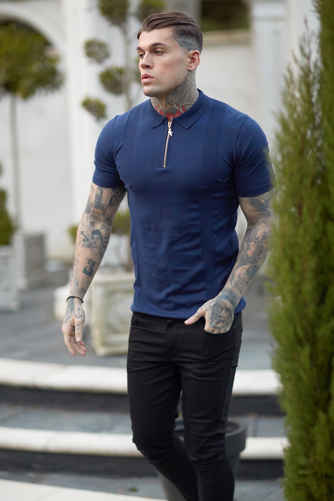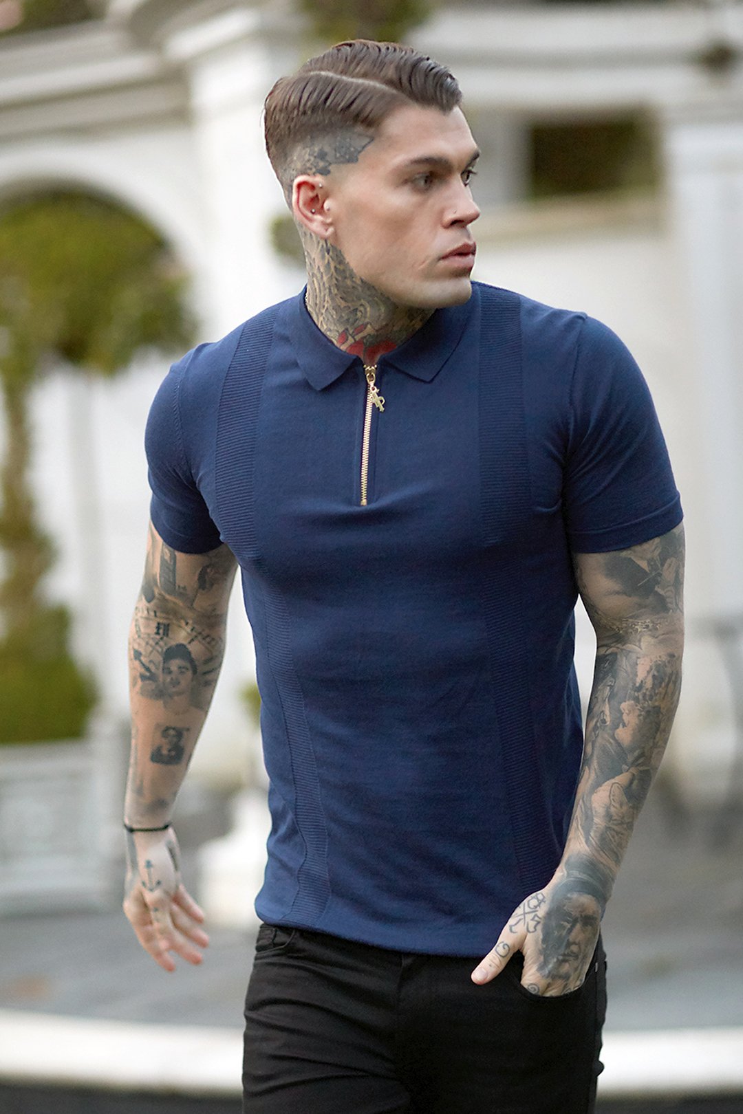 Father Sons Classic Navy and Gold Zip Knitted Short Sleeve Polo Shirt - FSH417