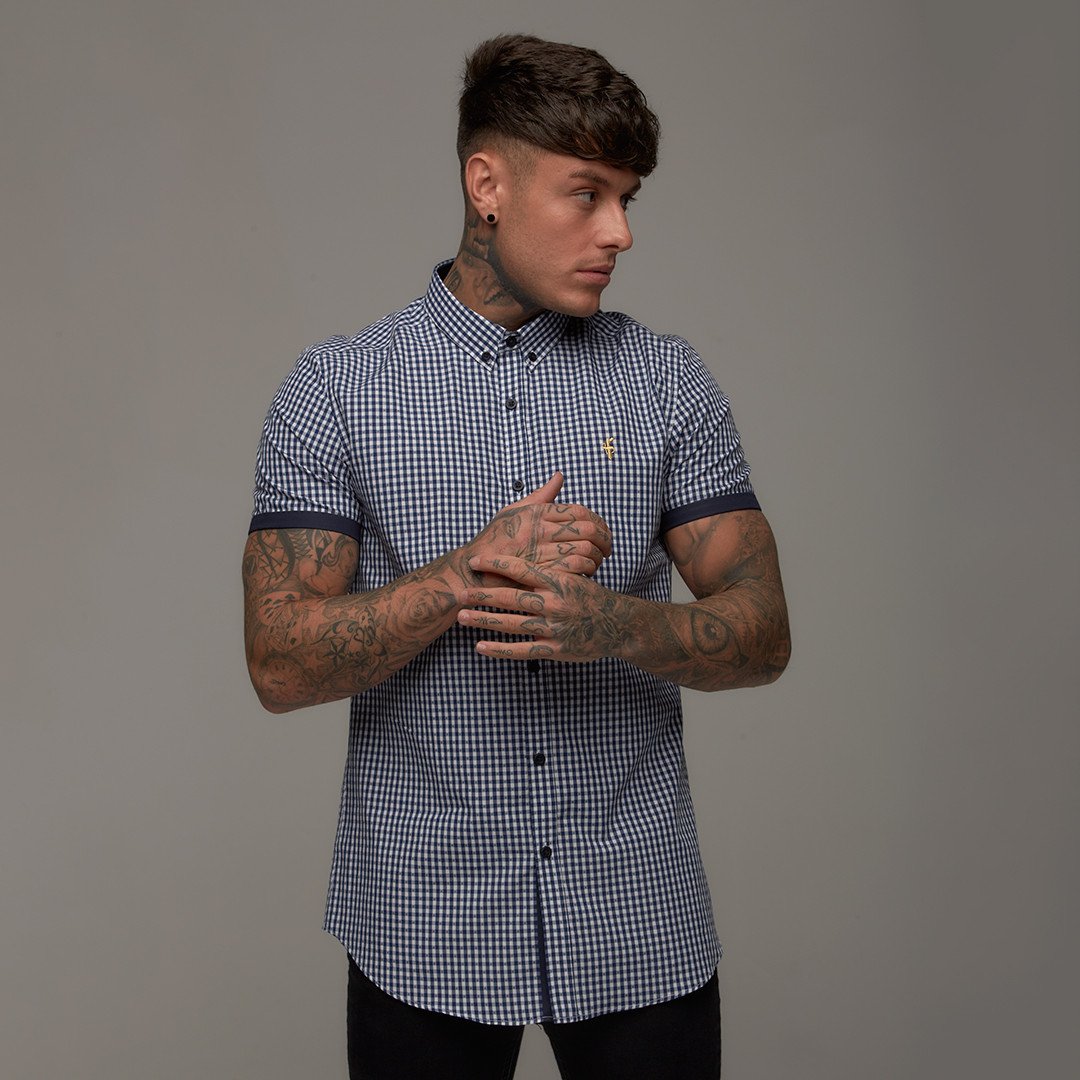 Father Sons Classic Navy White Gingham Dobby Short Sleeve (Gold Emblem) - FS243